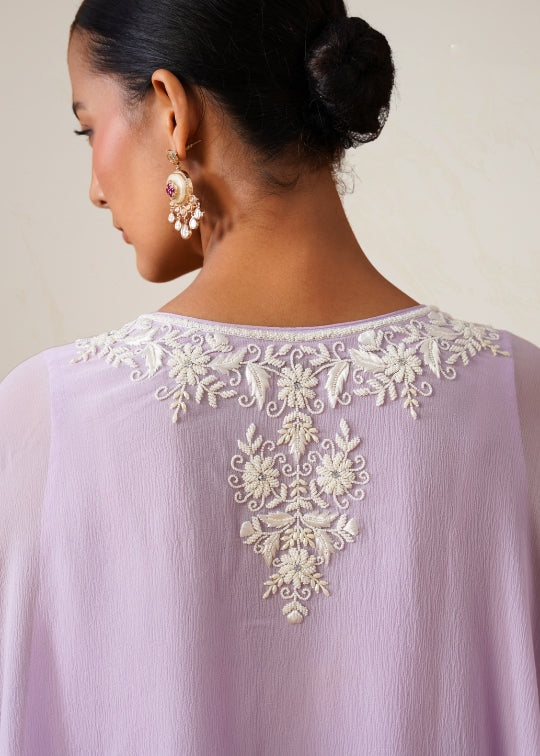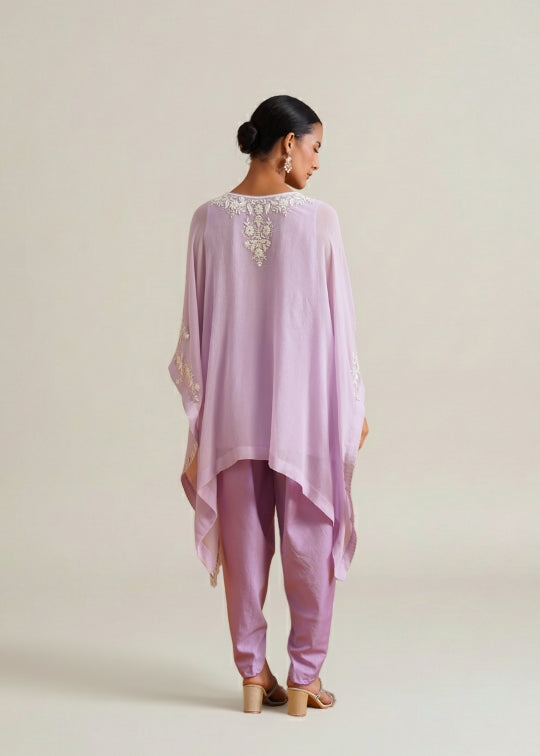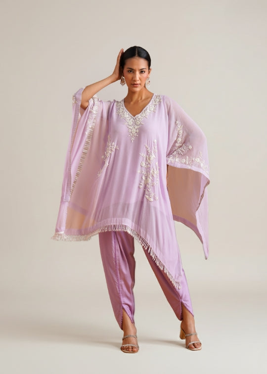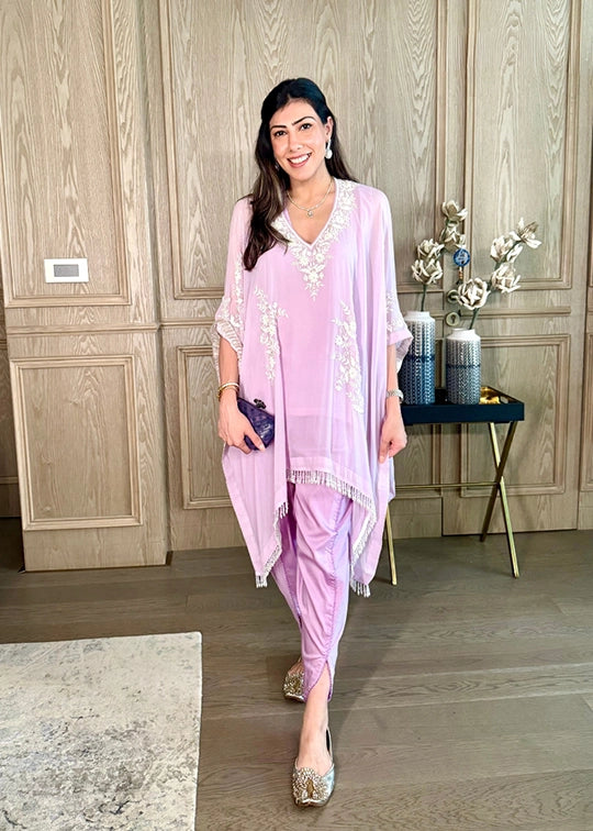 Step into the festive spirit with this regal purple ensemble, designed to embody elegance and celebration. The luxurious kaftan-style top features intricate Resham and moti (pearl) detailing that adds just the right touch of sparkle. Paired with graceful tulip pants, it's perfect for festive occasions, destination weddings, and joyful gatherings.