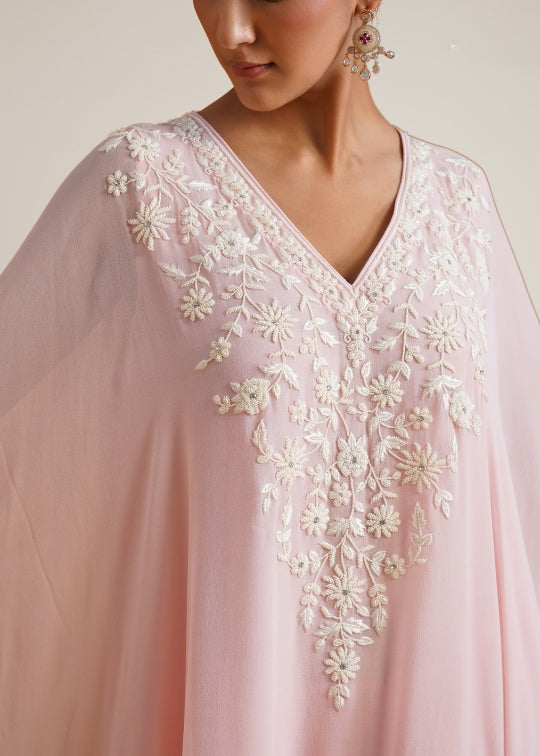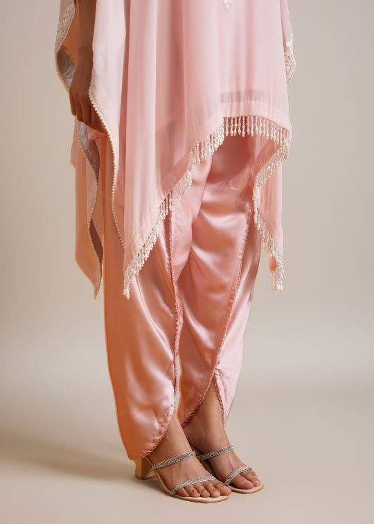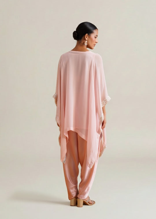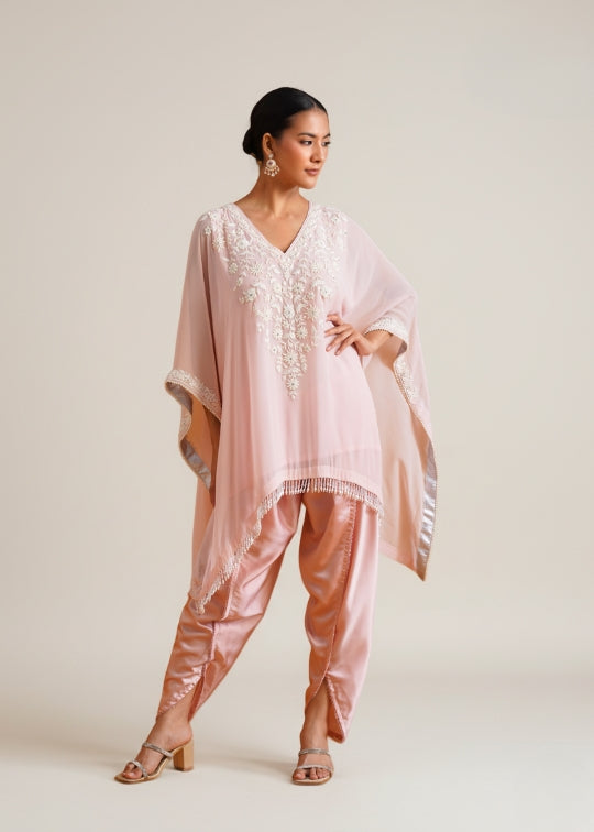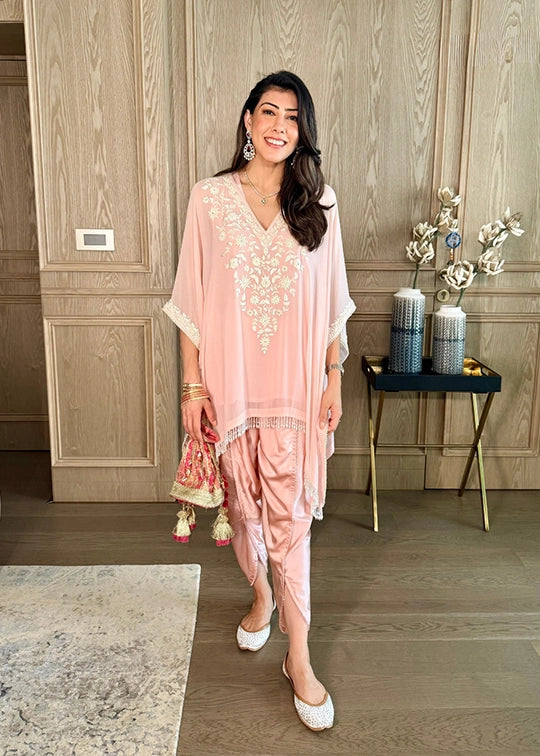 This dreamy dusty pink ensemble brings timeless charm to your celebration wardrobe. The flowing kaftan-style top is adorned with delicate Resham and moti (pearl) work, radiating subtle grandeur. Paired with elegant tulip pants, it's perfect for rituals, weddings, and traditional gatherings.