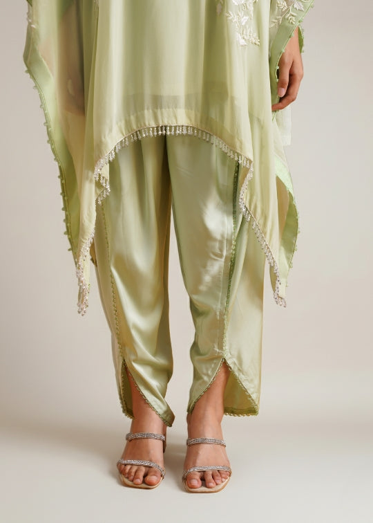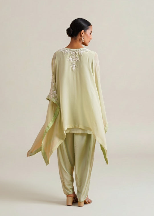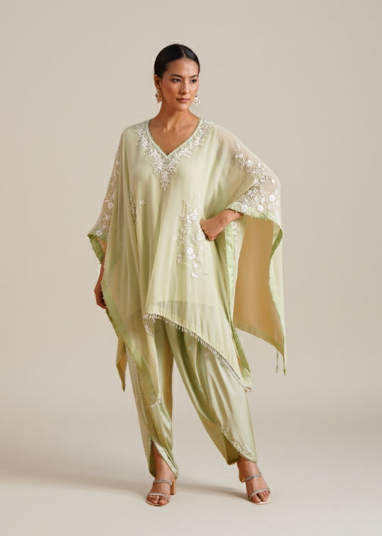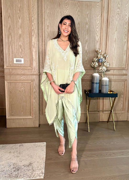 The graceful kaftan-style top is adorned with delicate Resham and moti (pearl) embroidery that shimmers like diyas against the cheerful yellow fabric. Paired with fluid tulip pants that move with lively spirit, this radiant ensemble is perfect for Haldi rituals, Diwali morning aartis, Govardhan Puja, or spreading joy at any seasonal celebration.