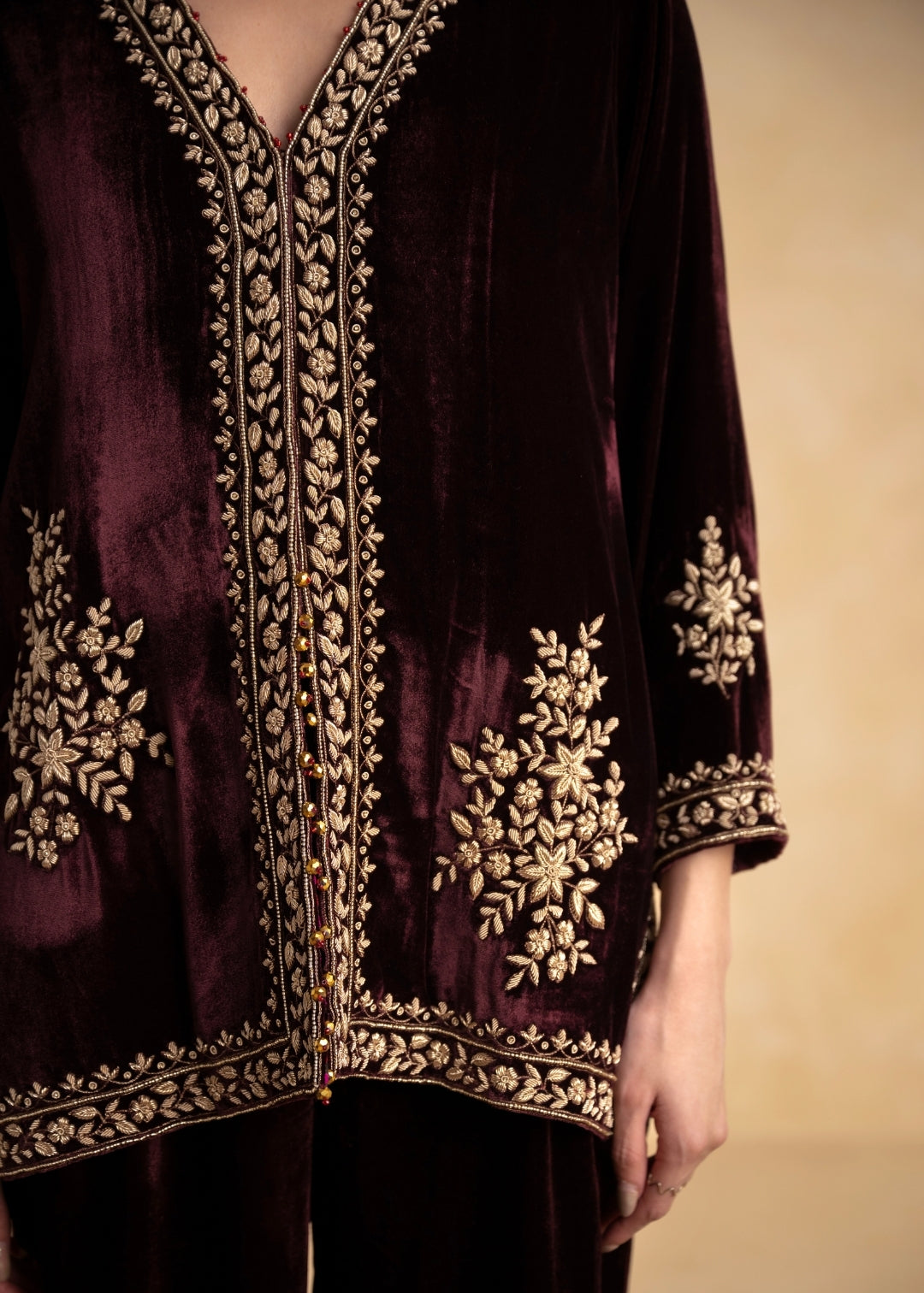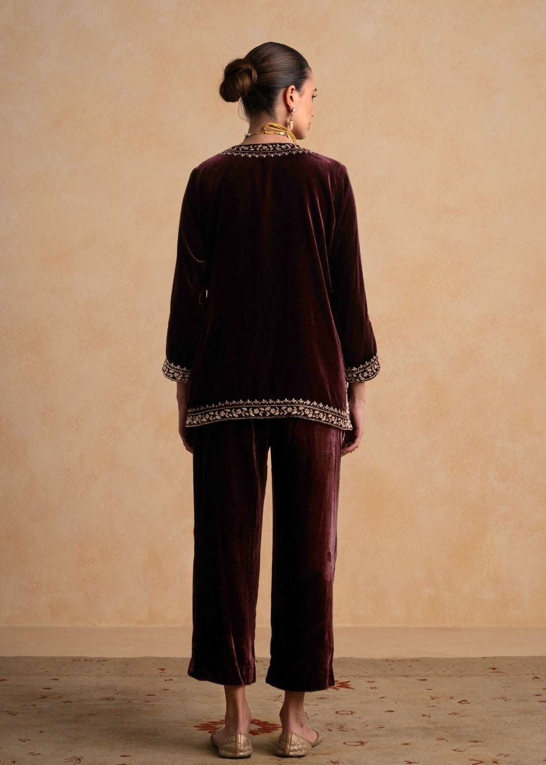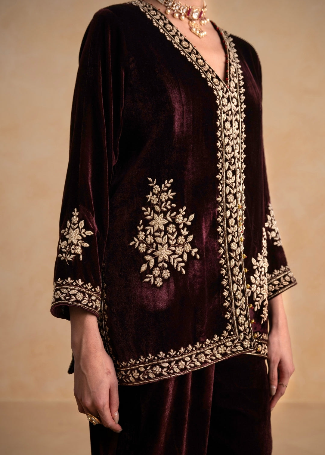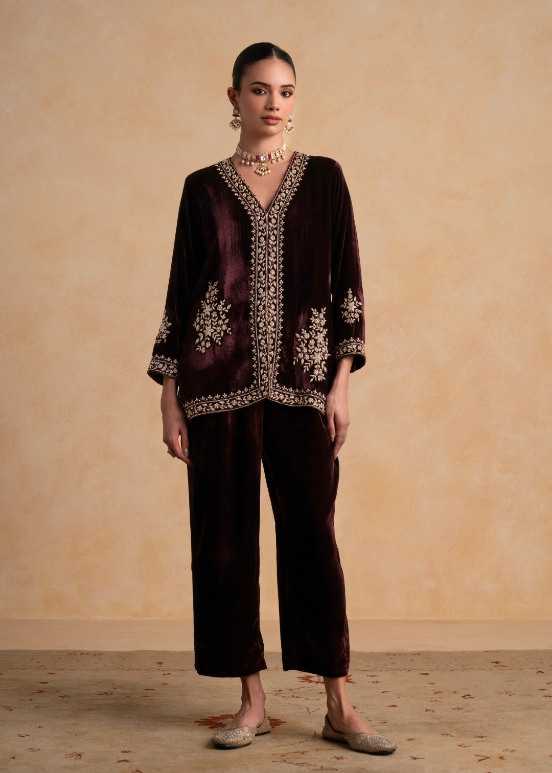 Our opulent silk velvet, REET, showcases the richness of velvet paired with graceful handcrafted motifs. A statement piece perfect for refined, celebratory dressing.