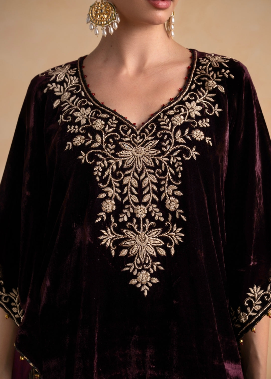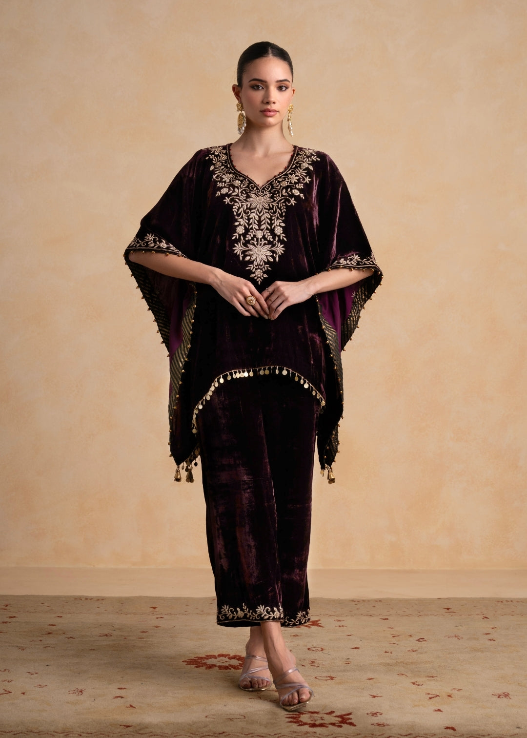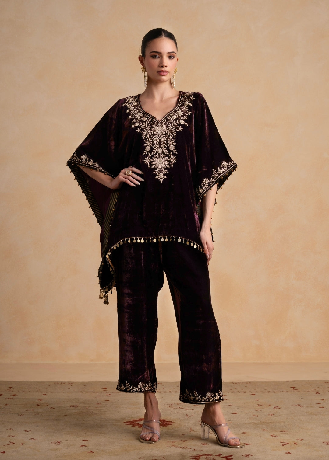 Our elegant ensemble SANAH, crafted in luxurious silk velvet and adorned with intricate embroidery, embodies an effortless, elevated charm. This kaftan flows with graceful ease, making it perfect for creating a refined yet comfortably expressive look.